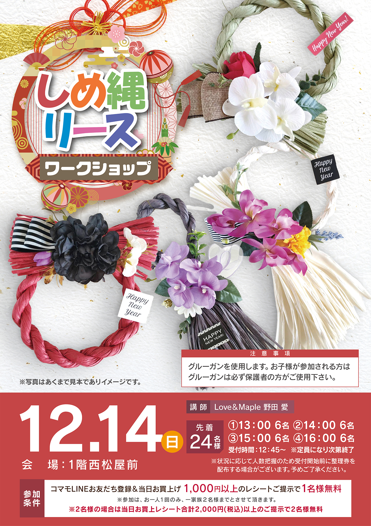 2025.12.10 しめ縄リースワークショップ 『しめ縄リースワークショップ』 お花やグリーン、飾り素材を使ってオリジナルのしめ縄リースをお作りいただけます★ 12月14日(日)開催! 詳細はポスター画像をご確認ください。