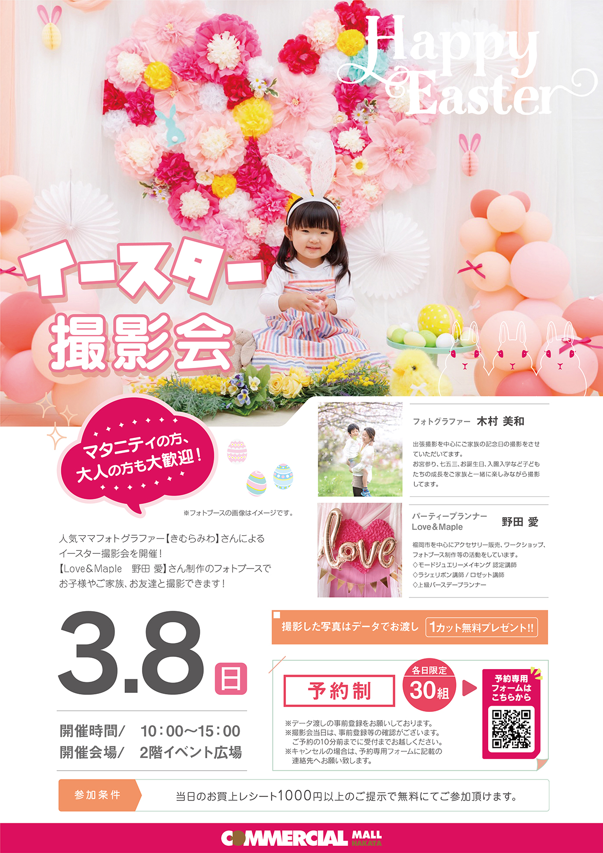 2026.02.27 イースター撮影会 「イースター撮影会」 人気ママフォトグラファー【きむらみわ】さんによる イースター撮影会を開催(eighthnote) 【Love&Maple 野田 愛】さん制作のフォトブースでお子様やご家族、お友達と撮影できます! 【予約制】 下記URLよりご予約ください。 https://ws.formzu.net/sfgen/S41675942