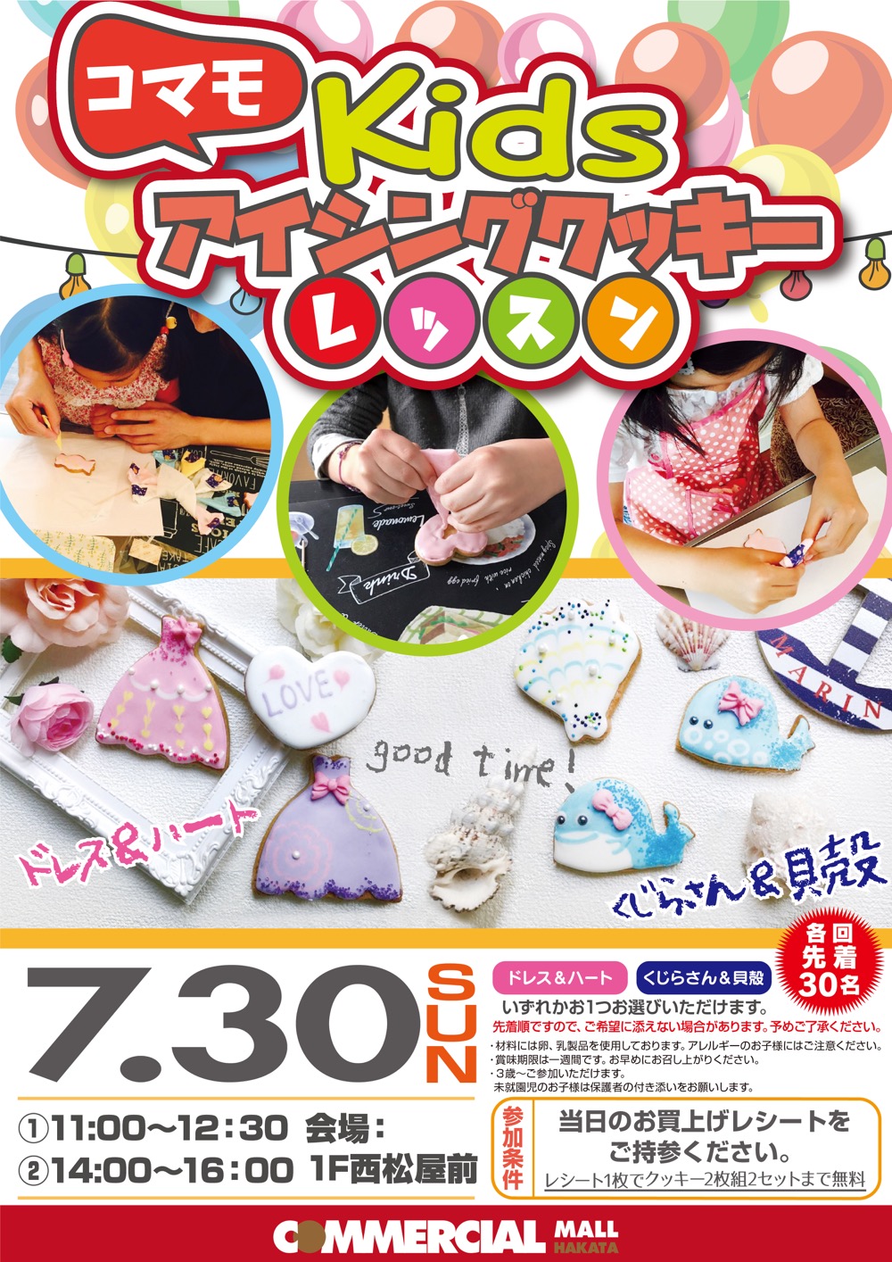 2017.07.07 7/30(日) Kidsアイシングクッキーレッスン開催のお知らせ! ①11:00〜12:30 ②14:00〜16:00 各回先着30名 ・当日のお買上げレシートをご持参下さい。 レシート1枚でクッキー2枚組2セットまで無料でお作りいただけます。 ・材料には卵、乳製品を使用しております。アレルギーのお子様にはご注意ください。 ・賞味期限は一週間です。お早めにお召し上がりください。 ・3歳〜ご参加いただけます。未就園児のお子様は保護者の付き添いをお願いします。