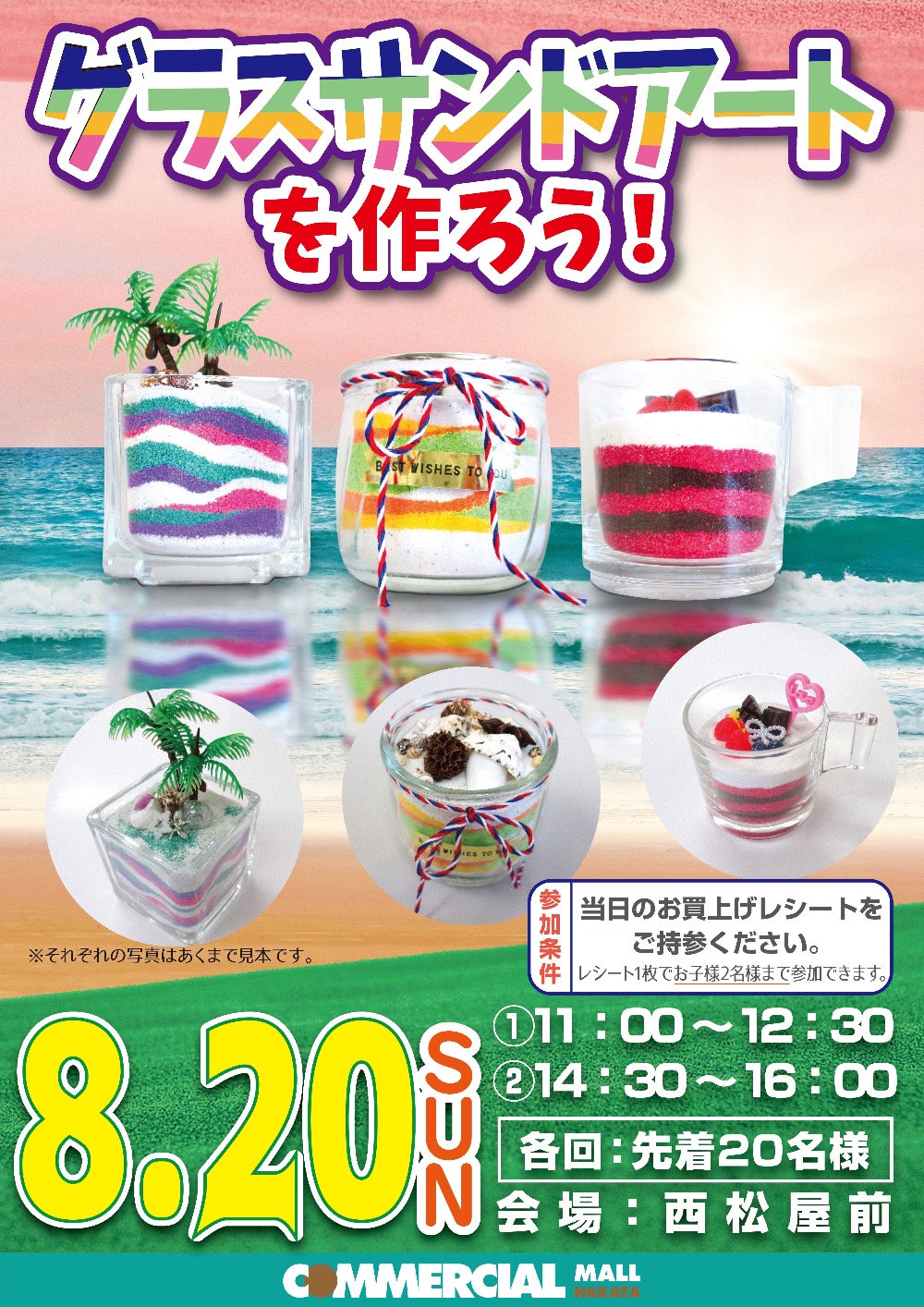 2017.07.24 8月20日(日) グラスサンドアートを作ろう! ①11:00〜12:30 ②14:30〜16:00 各回:先着20名様 当日のお買上げレシートをご持参下さい。 レシート1枚でお子様2名様まで参加できます。