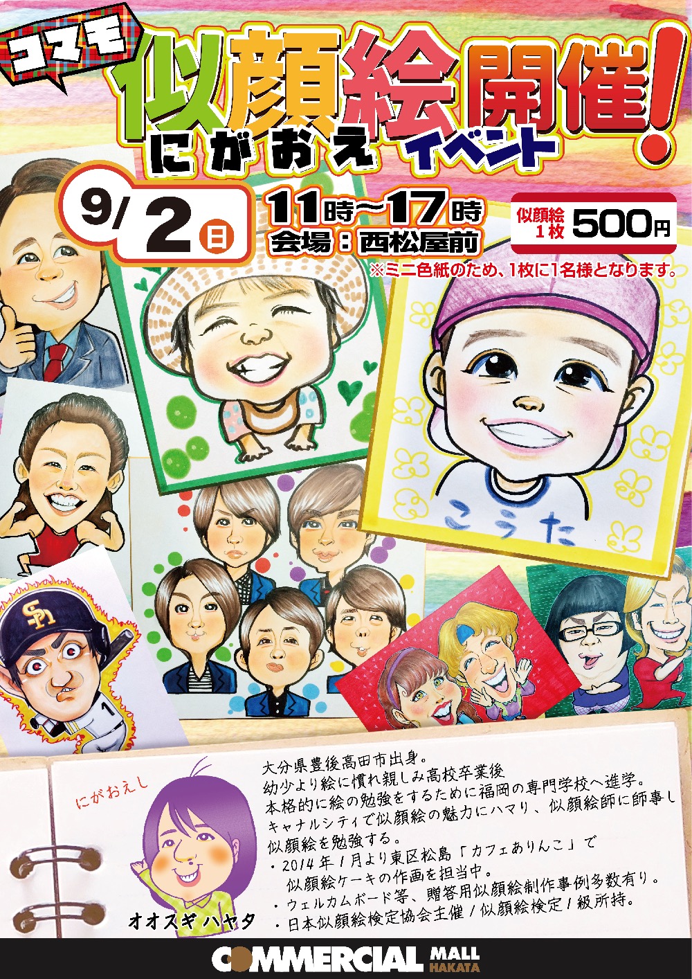 2018.08.20 9月2日(日) 似顔絵イベント開催のお知らせ! 日時:9月2日(日) 時間:11:00〜17:00 ・似顔絵1枚500円、ミニ色紙のため、似顔絵は1枚につき1名様となります。 ・場所:西松屋前
